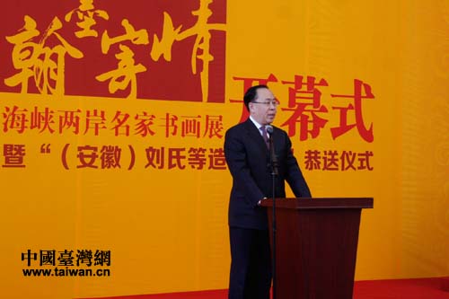 天津市武清區(qū)區(qū)委書記張勇在海峽兩岸名家書畫展暨“劉氏等造石佛塔”恭送儀式上致辭。(中國臺灣網 雍紫薇 攝)
