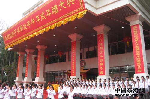 中國臺灣網(wǎng)4月9日東莞消息 日前,第三屆海峽兩岸(粵臺)中等教育論壇暨東莞臺商子弟學校甲午年成年禮大典在東莞臺商子弟學校隆重舉行,來自兩岸67所中等教育學校近80位校長及相關(guān)負責人齊聚一堂,互相交流、探討如何落實中華文化傳承及創(chuàng)新教學的做法。