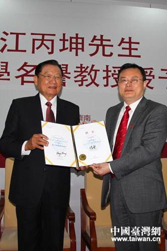 張榮校長向江丙坤先生頒發(fā)山東大學(xué)名譽教授聘書。(圖片來源:山東省臺辦)