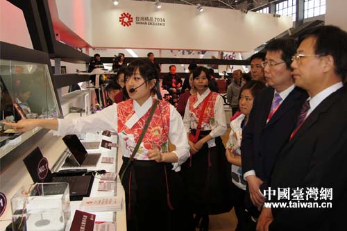 山東省貿(mào)促會(huì)副會(huì)長(zhǎng)林源、濟(jì)南市政府副秘書長(zhǎng)耿建新等參觀2014貴州(貴陽(yáng))臺(tái)灣名品博覽會(huì)“臺(tái)灣精品館”。(圖片來(lái)源:山東省臺(tái)辦)