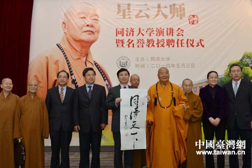 中國臺灣網(wǎng)5月4日上海消息 5月3日上午,臺灣佛光山開山宗長、國際佛光會世界總會會長、禪門臨濟(jì)宗第48代傳人星云大師訪問同濟(jì)大學(xué),并受聘為該校名譽(yù)教授。上海同濟(jì)大學(xué)黨委書記周祖翼會見了星云大師一行。校長裴鋼向星云大師頒發(fā)名譽(yù)教授聘書并其佩戴了;。