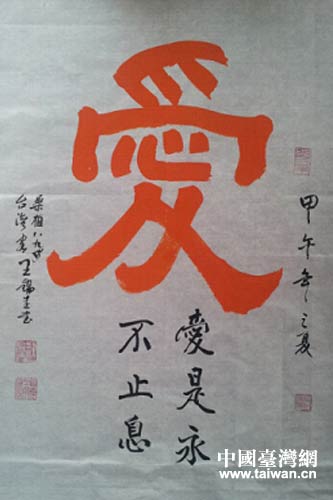 “我感覺自己的書法作品很普通,壓根沒想到在外面還挺有名氣。”王錫圭介紹說,“臺灣成功大學的校長經常找我寫字送人!薄拔业淖謴膩聿毁u,都是送人。我每年在多所學校培訓書法課,遇到青年學生問我求字,我是有求必應。因為書法對我來說是件快樂的事,我從來不用書法換取報酬。當然,有的商人或者老板向我求字后,會給我封個紅包,我也會收,畢竟紙墨都是要花錢買來的嘛!蓖蹂a圭老人總是開朗中透著幽默。