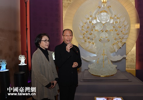 臺灣琉璃藝術家張毅介紹楊惠姍創(chuàng)作兩米高琉璃千手千眼觀音像的過程。(上海臺辦 葛鳳章 攝)