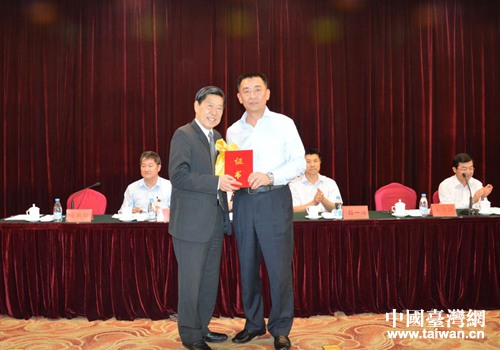 市臺(tái)辦李兆兵主任代表主管部門向王金銷會(huì)長(zhǎng)頒發(fā)協(xié)會(huì)印鑒和任職證書。(圖片來源:濟(jì)南市臺(tái)辦)