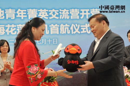 中國(guó)臺(tái)灣網(wǎng)7月10日上海訊 首個(gè)上海直飛臺(tái)灣花蓮由春秋航空公司執(zhí)飛的包機(jī)今天14:55從上海浦東國(guó)際機(jī)場(chǎng)啟航,由上海市臺(tái)辦、上海市教委與花蓮縣政府共同主辦的滬臺(tái)兩地青年菁英交流營(yíng)正式拉開帷幕。上海市政府副秘書長(zhǎng)宗明、上海市臺(tái)辦巡視員李雷鳴、花蓮縣政府秘書長(zhǎng)顏新章、上海市教委副主任丁曉東、春秋航空公司總經(jīng)理張秀智等出席了在上海浦東國(guó)際機(jī)場(chǎng)舉辦的首航儀式。