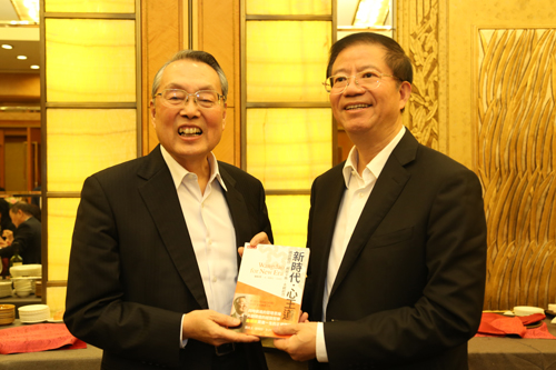 四川省人大常委會副主任彭渝(右)在成都宴見了臺灣嘉賓一行,圖為兩岸創(chuàng)意產(chǎn)業(yè)合作論壇籌委會共同召集人、臺灣臺灣文化藝術(shù)基金會董事長施振榮先生(左)向彭渝副主任贈送自己的新書。