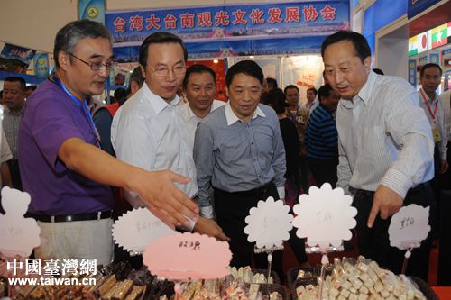 2015年12月,海南省委副書記李軍(左二)考察中國(海南)國際熱帶農(nóng)產(chǎn)品冬季交易會臺灣展位。(圖片來源:海南省臺辦)