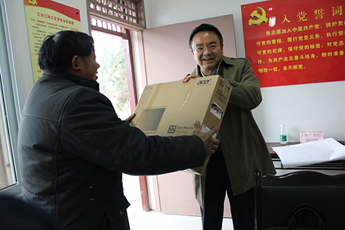 綿陽(yáng)市委常委吳顯仁(右)為北川縣小壩鄉(xiāng)大華村贈(zèng)送電腦。