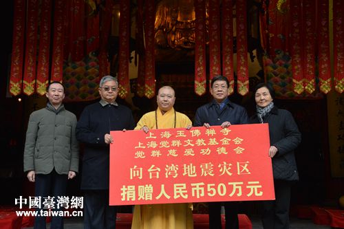 捐贈儀式上,上海玉佛禪寺、上海覺群文教基金會、覺群慈愛功德會向臺灣地震災(zāi)區(qū)捐贈50萬元。玉佛禪寺全體僧職人員及護(hù)法居士、覺群志工代表也紛紛伸出援手。