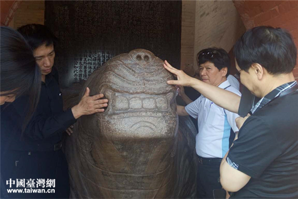 參訪團(tuán)成員撫摸龜趺討吉利。(中國臺灣網(wǎng) 劉暢 攝)