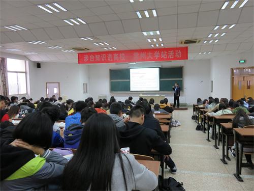 中國臺灣網(wǎng)10月29日常州訊 為幫助在常大學生更好地掌握涉臺知識,理解中央對臺工作的方針政策,積極參與兩岸青少年交流交往活動,江蘇常州市臺辦從今年下半年起,將持續(xù)開展“涉臺知識進高!被顒。10月27日下午,由常州市臺辦、團市委與常州大學商學院聯(lián)合舉辦的“涉臺知識進高!V荽髮W站活動”在常大白云校區(qū)成功舉行。