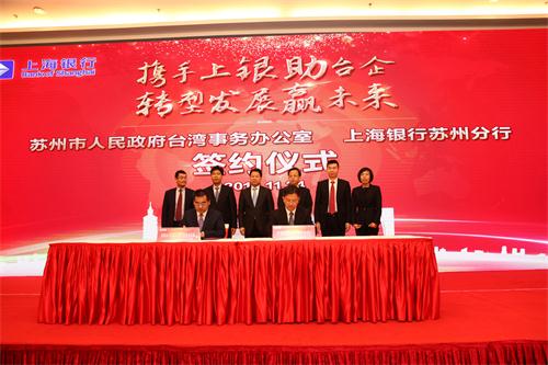 蘇州市臺(tái)辦主任楊軍和上海銀行蘇州分行行長(zhǎng)崔慶軍簽署了金融服務(wù)臺(tái)企發(fā)展協(xié)議文本。(中國(guó)臺(tái)灣網(wǎng)、蘇州臺(tái)辦聯(lián)合報(bào)道)