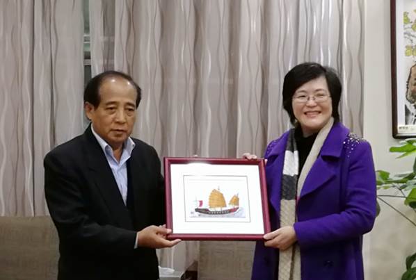 汕頭市委常委、統(tǒng)戰(zhàn)部部長(zhǎng)陳麗文(右)向簡(jiǎn)東明(左)贈(zèng)送紀(jì)念品