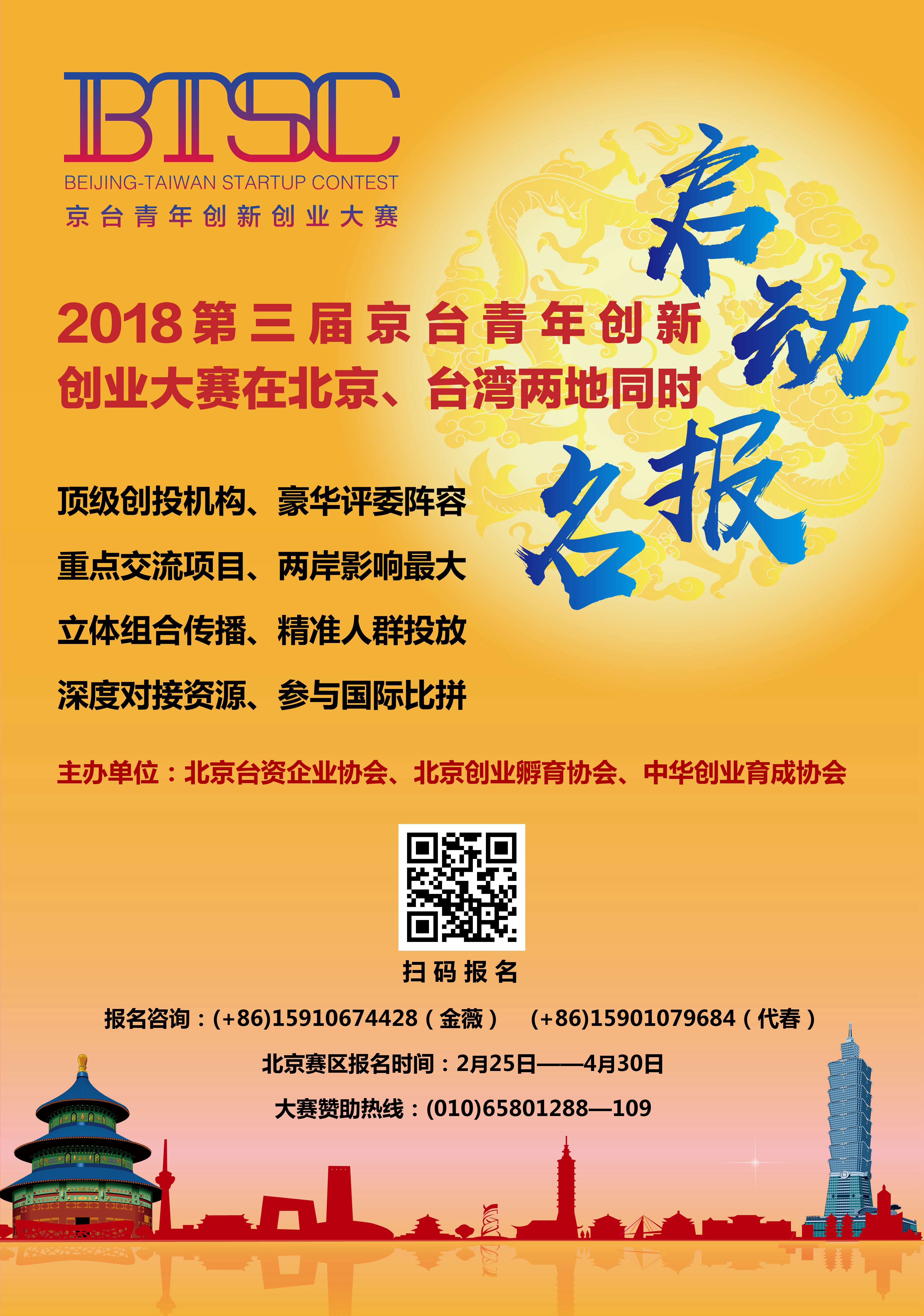 2月25日,由北京臺(tái)資企業(yè)協(xié)會(huì)發(fā)起并聯(lián)合北京創(chuàng)業(yè)孵育協(xié)會(huì)、臺(tái)灣中華創(chuàng)業(yè)育成協(xié)會(huì)共同主辦的2018第三屆京臺(tái)青年創(chuàng)新創(chuàng)業(yè)大賽在北京、臺(tái)灣兩地同時(shí)啟動(dòng)報(bào)名。
