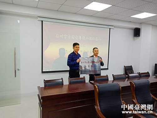 泉州市臺(tái)辦副主任李朝暉向園區(qū)管委會(huì)授牌。(圖片來源:安溪縣臺(tái)辦)