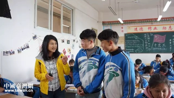楊茵與“玉樹班”學(xué)生旦周才仁、尕尼瑪交流。(圖片來源:四川省臺(tái)辦)