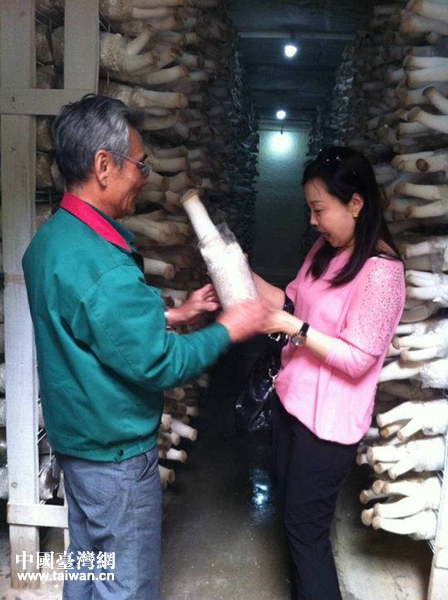 林次郎(左一)在杏鮑菇生產(chǎn)車間。(圖片來源:四川省臺(tái)辦)