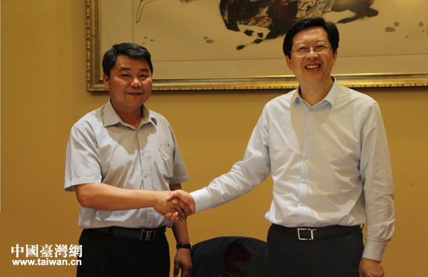 眉山市政府副市長肖忠良(左)與張啟盟理事主席座談交流。(圖片來源:眉山市臺辦)