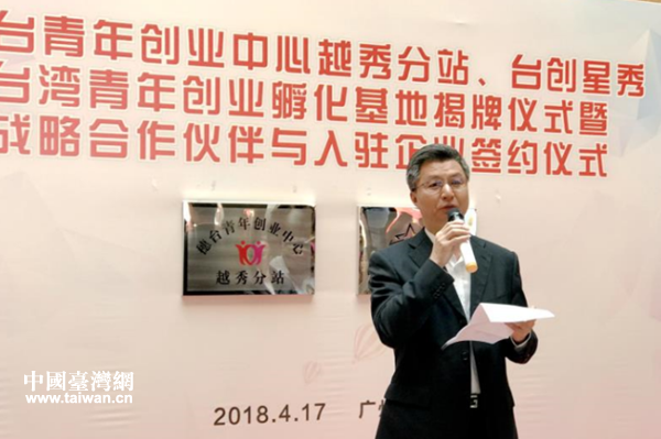 曾衛(wèi)東在揭牌儀式上致辭表示,近年來,我市以習近平新時代中國特色社會主義思想為指導,深入貫徹黨的十九大精神和習近平總書記對臺工作重要思想,認真貫徹落實國臺辦對臺工作部署,積極推進臺灣青年來穗實習就業(yè)創(chuàng)業(yè)工作,先后創(chuàng)建立了以黃埔區(qū)臺企服務中心、天河區(qū)眾創(chuàng)五號空間“廣州臺灣青年之家”和花都大新美術館等為代表的一批面向臺灣青年的創(chuàng)業(yè)基地,并以基地為載體先后引進臺灣青創(chuàng)項目和團隊近50個,提供臺灣青年就業(yè)崗位200多個,接待實習體驗的臺灣學生近千人,取得了良好效果。今天,在越秀區(qū)委、區(qū)政府的高度重視、大力支持和積極推動下,成立了越秀區(qū)首個臺灣青年創(chuàng)業(yè)基地,為臺灣青年到廣州市越秀區(qū)創(chuàng)業(yè)發(fā)展提供了平臺與服務,進一步推動和營造了臺灣青年在廣州創(chuàng)新創(chuàng)業(yè)良好氛圍。曾衛(wèi)東祝愿越秀區(qū)臺青創(chuàng)業(yè)基地盡快開花結果,希望越秀區(qū)根據(jù)國臺辦等部門日前頒布的《關于促進兩岸經濟文化交流合作的若干措施》(以下簡稱“31條措施”),結合實際,積極探索臺青工作新思路、新方法,制訂出臺有關推動臺灣青年創(chuàng)新創(chuàng)業(yè)的實施辦法,落實對臺灣青年在越秀區(qū)創(chuàng)新創(chuàng)業(yè)政策和資金扶持的具體措施,積極吸引鼓勵臺灣青年來廣州創(chuàng)業(yè)發(fā)展。