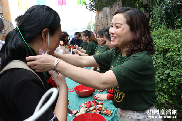 工作人員向參加活動的民眾佩戴用艾草制作的福包。(中國臺灣網(wǎng) 郜利敏 攝)
