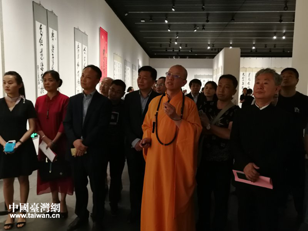 星云文化教育公益基金會(huì)監(jiān)事長(zhǎng)、北京光中文教館館長(zhǎng)慧寬法師介紹作品。(圖片來(lái)源:貴州省臺(tái)辦)