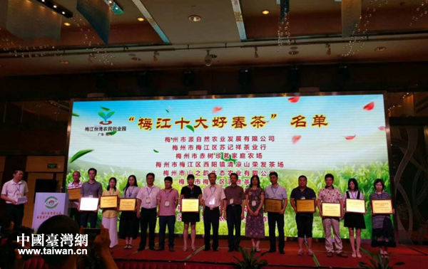 海峽兩岸專家為榮獲”梅江區(qū)十大好春茶“的茶企業(yè)頒獎(jiǎng)。(圖片來源:梅州臺(tái)創(chuàng)園)