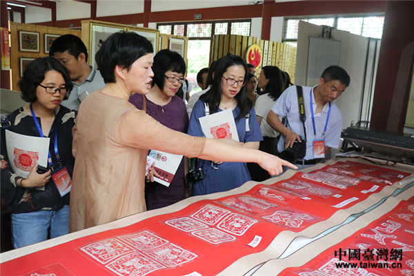 兩岸媒體走進(jìn)鄂州民間工藝美術(shù)館,參觀雕花剪紙、麥稈畫等民間工藝品,了解鄂州市傳統(tǒng)文化。(中國臺灣網(wǎng) 郜利敏 攝)