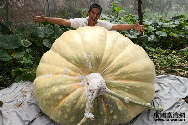 臺(tái)灣“南瓜達(dá)人”徐滄浩在梅州種出1040斤南瓜,或創(chuàng)中國(guó)最重南瓜紀(jì)錄。(圖片來(lái)源:梅江區(qū)臺(tái)辦)