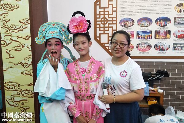 兩位臺灣學(xué)生在臺上向大家展示粵劇學(xué)習(xí)成果。(圖片來源:梧州市臺辦)