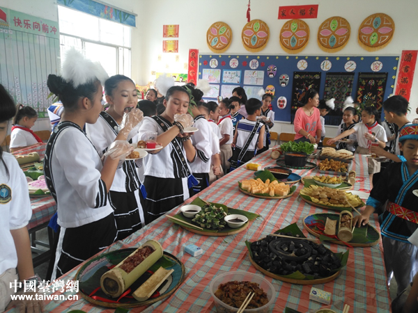 臺(tái)灣花蓮縣新城鄉(xiāng)北埔小學(xué)生品嘗壯鄉(xiāng)美食。(圖片來(lái)源:廣西河池市金城江區(qū)臺(tái)辦)