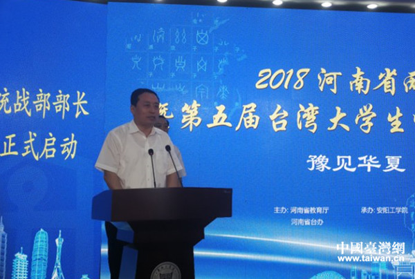 中共河南省委常委、統(tǒng)戰(zhàn)部部長孫守剛宣布 “2018河南省兩岸青年交流月暨第五屆臺灣大學(xué)生中原文化之旅”正式啟動。(河南省臺辦供圖)