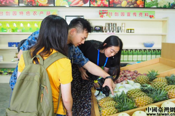 臺(tái)灣學(xué)生認(rèn)真研究臺(tái)創(chuàng)園的水果。(圖片來源:珠海市臺(tái)灣事務(wù)局)