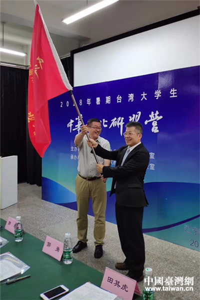 省臺辦交流處處長郭彬(左1)向臺灣代表授營旗。(圖片來源:遼寧省臺辦)