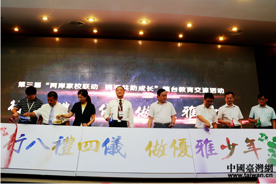 中國臺灣網(wǎng)7月22日鎮(zhèn)江訊(記者 趙苗青) 7月21日上午,第三屆“兩岸家校聯(lián)動 攜手共助成長”教育交流活動在江蘇省鎮(zhèn)江市啟動,臺灣新北市與鎮(zhèn)江市中小學(xué)校長代表、家長代表、師生代表共200多人齊聚一堂,以“行八禮四儀 做優(yōu)雅少年”為主題展開探討。江蘇省臺辦副主任張為、臺灣新北市議員蔡葉偉等嘉賓出席活動啟動儀式并參與交流。