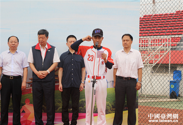 國臺辦交流局副局長董碧幽出席開幕式并宣布比賽開幕,并與石景山區(qū)副區(qū)長左小兵、海峽兩岸體育交流運動會組委會臺方主席吳清基先生、北京市大學生體育協(xié)會棒壘球分會主席、北方工業(yè)大學王建穩(wěn)副校長共同為比賽開球。