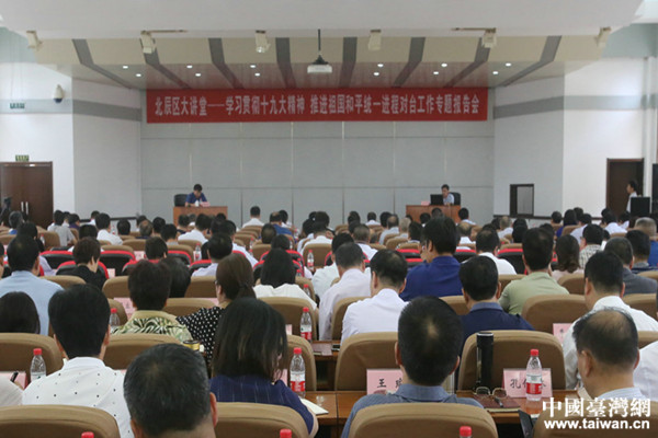 中國(guó)臺(tái)灣網(wǎng)7月27日北辰訊 為全面學(xué)習(xí)貫徹黨的十九大精神和習(xí)近平總書(shū)記新時(shí)代對(duì)臺(tái)工作重要思想,切實(shí)提高領(lǐng)導(dǎo)干部處理對(duì)臺(tái)問(wèn)題的政策能力水平,不斷推進(jìn)全區(qū)對(duì)臺(tái)工作再上新臺(tái)階,近日,天津市北辰區(qū)舉辦“北辰區(qū)大講堂——學(xué)習(xí)貫徹十九大精神 推進(jìn)祖國(guó)和平統(tǒng)一進(jìn)程”對(duì)臺(tái)工作專題報(bào)告會(huì)。區(qū)長(zhǎng)王寶雨,區(qū)人大常委會(huì)主任王志平,區(qū)委辦公室主任陳健等區(qū)領(lǐng)導(dǎo)出席,全區(qū)處級(jí)領(lǐng)導(dǎo)干部約400人參加。報(bào)告會(huì)由區(qū)委常委、統(tǒng)戰(zhàn)部部長(zhǎng)陳永義主持。