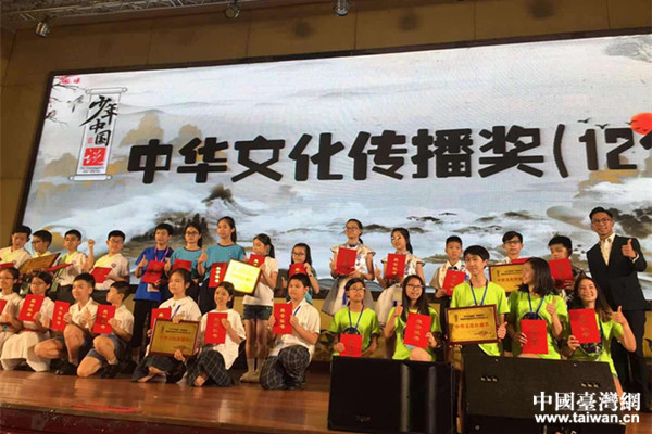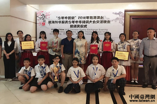 中國臺(tái)灣網(wǎng)7月31日江門訊 為貫徹落實(shí)黨的十九大精神以及“惠臺(tái)31條”措施要求,鼓勵(lì)臺(tái)灣同胞參與中華經(jīng)典誦讀工程等中華優(yōu)秀傳統(tǒng)文化傳承發(fā)展工程,廣東省江門市舉辦了“少年中國說”2018年粵港澳臺(tái)暨海外華裔青少年中華詩詞大會(huì)。7月12日當(dāng)天迎來了大會(huì)的總決賽,并舉行了頒獎(jiǎng)晚宴。江門市委常委、統(tǒng)戰(zhàn)部部長易中強(qiáng),江門市委常委、宣傳部部長周惠紅,江門市委臺(tái)辦主任譚健文等出席了晚會(huì),并向活動(dòng)的獲獎(jiǎng)個(gè)人、團(tuán)隊(duì)、團(tuán)體和熱心人士頒獎(jiǎng)。其中,江門市臺(tái)灣代表隊(duì)小學(xué)隊(duì)獲得了中華文化傳播獎(jiǎng),臺(tái)灣代表隊(duì)初中隊(duì)獲得了中學(xué)組二等獎(jiǎng)。