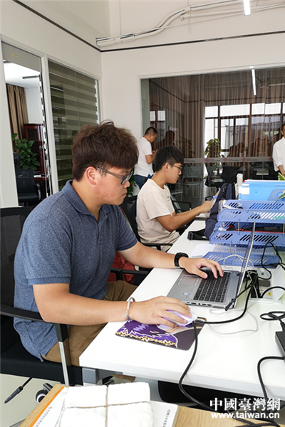 臺(tái)灣大學(xué)資訊管理學(xué)碩士韓宏光(右)和臺(tái)灣中華大學(xué)機(jī)械系本科生黃傳恩(左)在聯(lián)通東南研究院實(shí)習(xí)。(中國(guó)臺(tái)灣網(wǎng) 郜利敏 攝)
