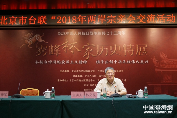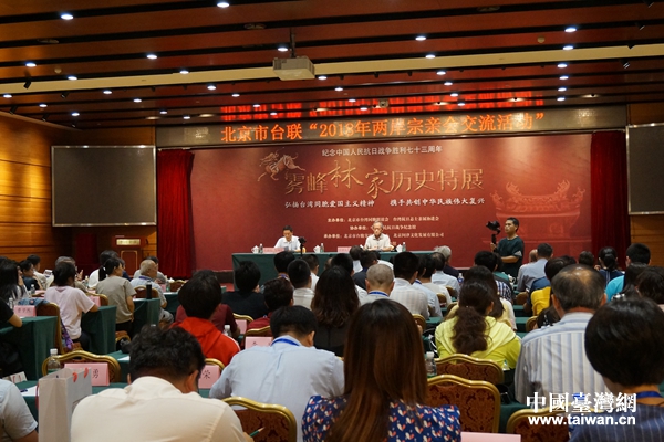 中國(guó)臺(tái)灣網(wǎng)8月14日北京訊 8月13日,北京市臺(tái)聯(lián)組織的“2018年兩岸宗親會(huì)交流活動(dòng)”在京開啟。以臺(tái)灣抗日志士親屬協(xié)進(jìn)會(huì)理事長(zhǎng)林銘鐔為團(tuán)長(zhǎng)的臺(tái)灣霧峰林家參訪團(tuán)一行14人等應(yīng)邀參加活動(dòng)。活動(dòng)期間,將舉辦專題報(bào)告會(huì)和“霧峰林家”歷史特展、拜會(huì)全國(guó)臺(tái)聯(lián)、參觀中國(guó)人民抗日戰(zhàn)爭(zhēng)紀(jì)念館和山西平型關(guān)戰(zhàn)役遺址。
