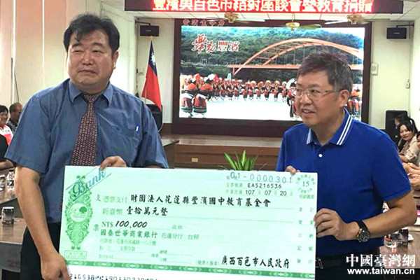 參訪團(tuán)向豐濱鄉(xiāng)捐贈(zèng)教育基金。(圖片來(lái)源:廣西百色市臺(tái)辦)