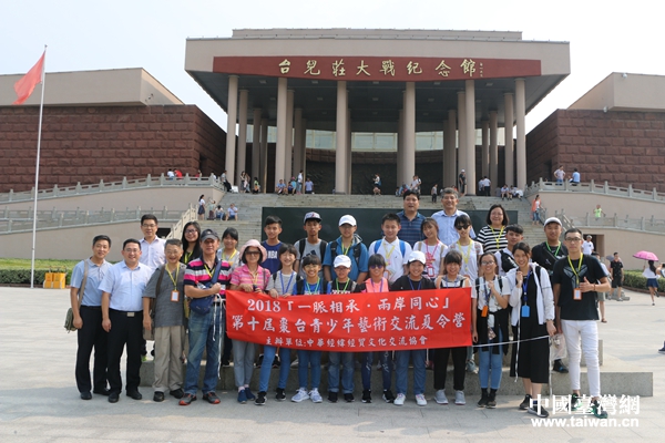 第十屆棗臺青少年藝術(shù)交流夏令營參與人員在臺兒莊大戰(zhàn)紀念館合影留念。(圖片來源:棗莊市臺辦)