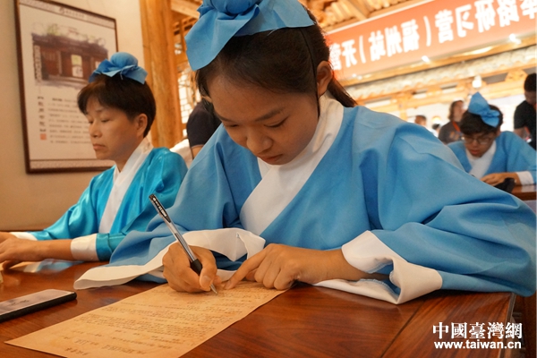 臺灣華梵大學、銘傳大學學生和在京青年臺胞大學生們以“士子”的身份,參加了此次考試,親身感受當年學子們勤奮讀書,報效國家的心路歷程,進一步了解科舉制度作為中國封建社會的制度支柱和文化主脈對臺灣產(chǎn)生的影響,更是對儒學文化有了深層次的認知。活動現(xiàn)場,研習營一行首先與福州市小朋友共同練習書寫毛筆字,體會中國書法之美感,接下來,學子們穿上統(tǒng)一的漢服,體驗當年正誼書院的“入學儀式”,并學習中華儒學禮儀,向朱子像行深衣禮,祭拜先賢。隨后,正誼書院楊瑞英老師為兩岸學子作了“兩岸書院文化源脈專題講座”。