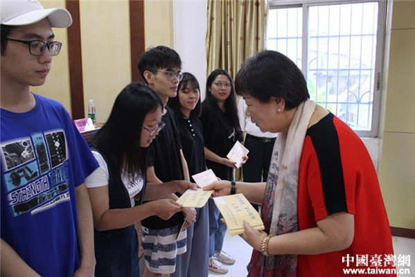 中杰公司劉何玉鈴向學生發(fā)放助學金。(圖片來源:肇慶市臺辦)