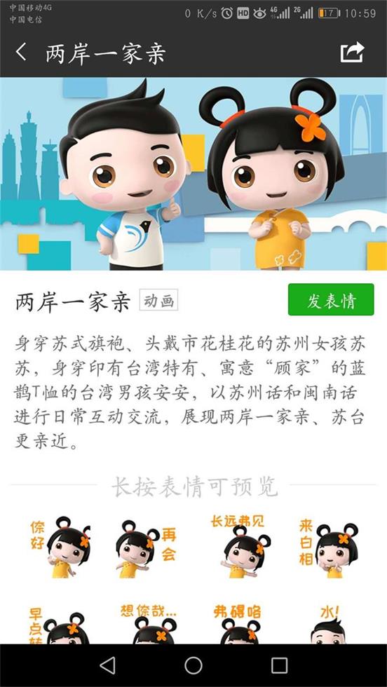 蘇州市臺辦以對臺工作者的使命感為砥礪,緊緊抓住微信在兩岸使用人數(shù)多、信息量大、傳播速度快、受眾范圍廣的特點,創(chuàng)意開發(fā)“兩岸一家親”主題微信表情包。表情包共24個表情,主角以頭頂發(fā)辮形似大陸送給臺灣的一對熊貓--團團、圓圓的耳朵,身穿蘇式旗袍、頭戴市花桂花的蘇州女孩蘇蘇,身穿印有臺灣特有、寓意“顧家”的藍鵲T恤的臺灣男孩安安,用蘇州話和閩南話進行日常交流互動,生動形象地展現(xiàn)兩岸青年熱情活潑、攜手共進的場景。