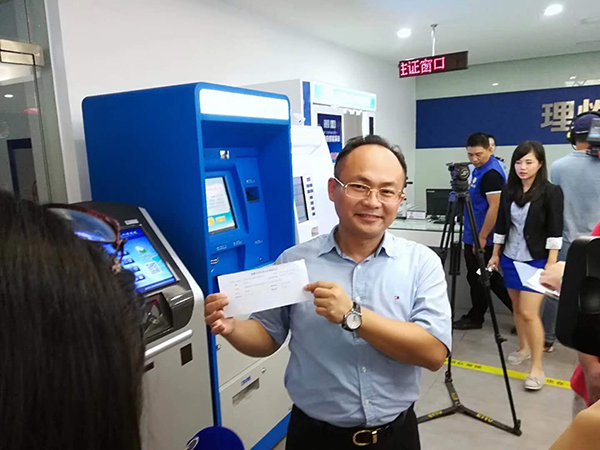 在兩岸媒體記者的見證下,廈門臺商協(xié)會會長吳家瑩成為廈門第一個辦理完成手續(xù)的臺胞。(福建省臺辦供圖)