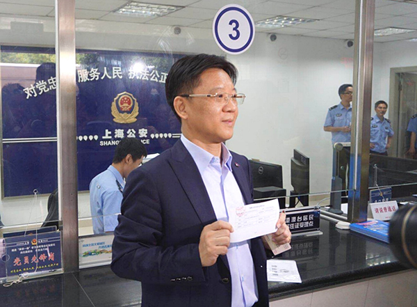 上海市臺灣同胞投資企業(yè)協(xié)會會長李政宏提交居住證申領(lǐng)資料。(上海市臺辦供圖)