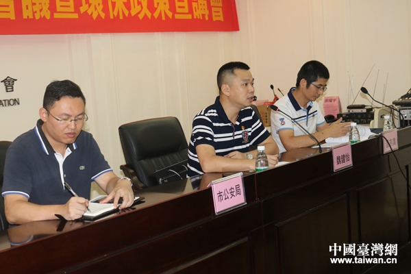 中山市公安局審批辦常務(wù)副主任魏健怡(中)、治安管理支隊(duì)?wèi)粽箨?duì)副大隊(duì)長(zhǎng)溫燕嵩(右)為中山市臺(tái)商投資企業(yè)協(xié)會(huì)理監(jiān)事宣講居住證申辦流程。(圖片來(lái)源:廣東省臺(tái)辦)