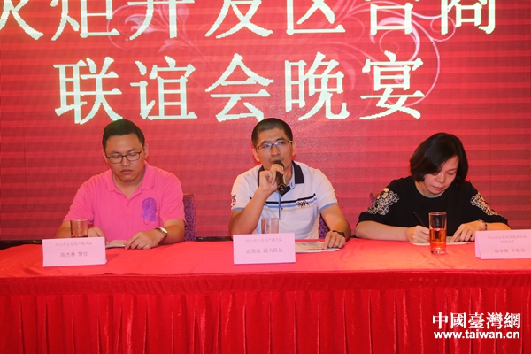 中山市治安管理支隊(duì)?wèi)粽箨?duì)副大隊(duì)長(zhǎng)溫燕嵩(中)、火炬開(kāi)發(fā)區(qū)公安分局戶政中隊(duì)中隊(duì)長(zhǎng)鄭小英(右)為火炬開(kāi)發(fā)區(qū)臺(tái)商、臺(tái)胞宣講居住證申辦流程。(圖片來(lái)源:廣東省臺(tái)辦)