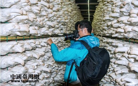 采訪團(tuán)深入生產(chǎn)廠房了解杏鮑菇生長情況。(圖片來源:四川省臺(tái)辦)