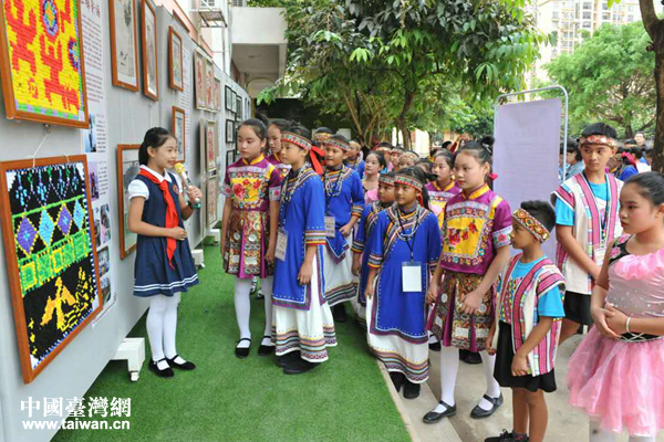 廣西民族師范學(xué)院附屬小學(xué)的紅領(lǐng)巾講解員給臺(tái)灣花蓮太平小學(xué)學(xué)生介紹壯族傳統(tǒng)藝術(shù)品——壯錦。(圖片來源:廣西臺(tái)辦)